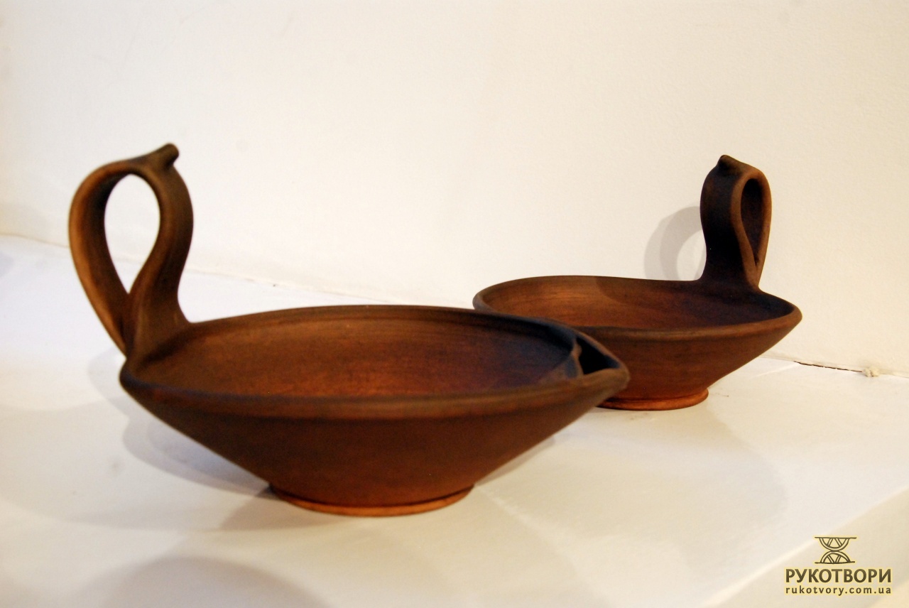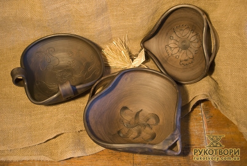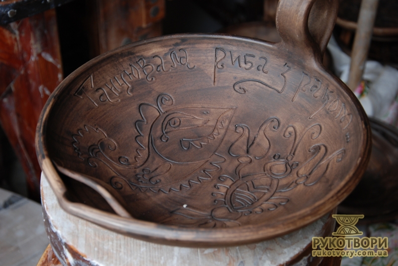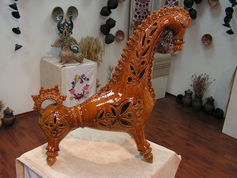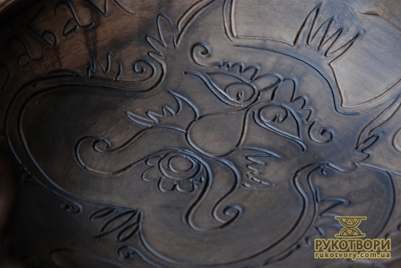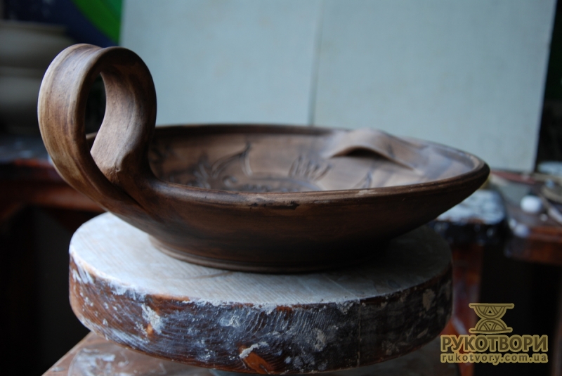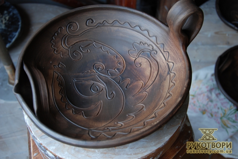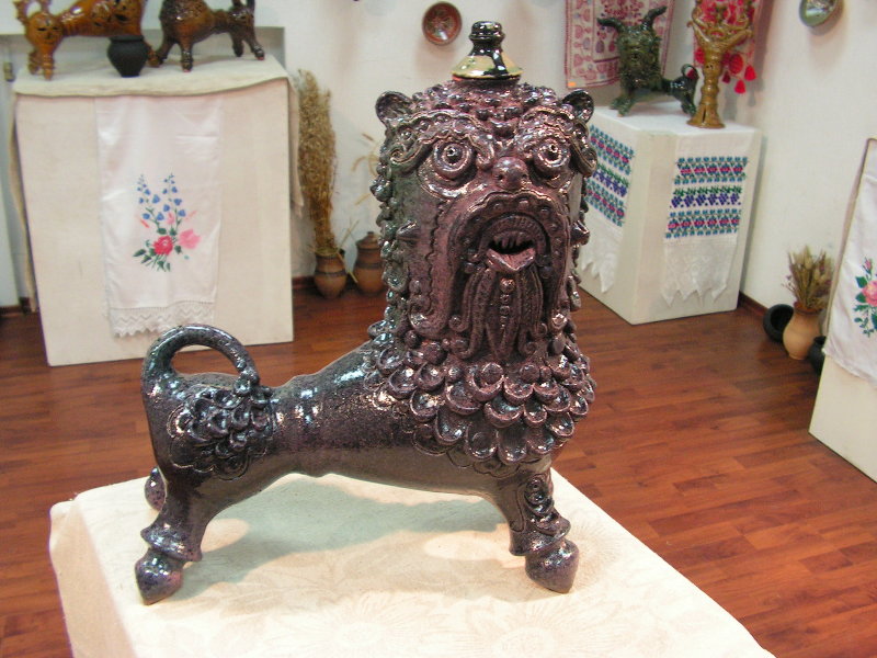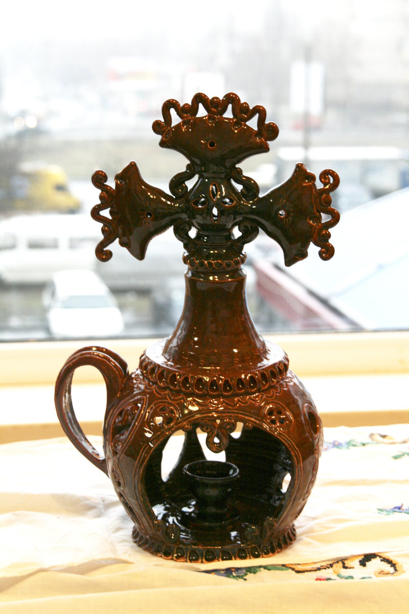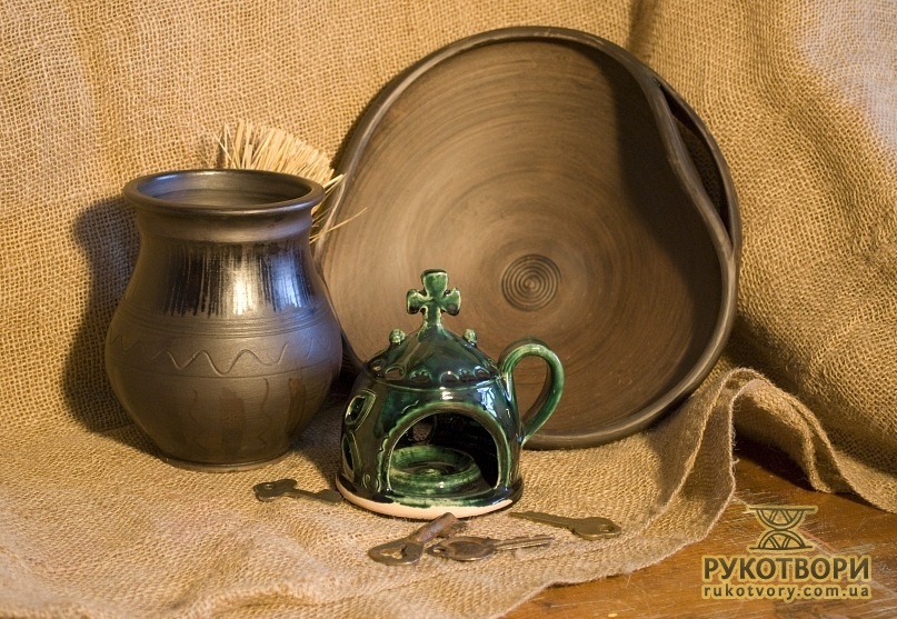 Practically all clay decorating and shaping techniques known in Ukrainian applied art are represented in the handiworks of this master. Here, there are figurative ornaments on plates; images of sacral symbols of Podillya pottery; creative search – variations of flyandrivka technique (national Ukrainian technique in majolica with paints applied on wet clay). Also, there is traditional decorative shaped sculpture including lembicks (decorative crockery having animal shapes), candlesticks and kurishky (small decorative chicken) – everything that represented Ukrainian national pottery at all times.