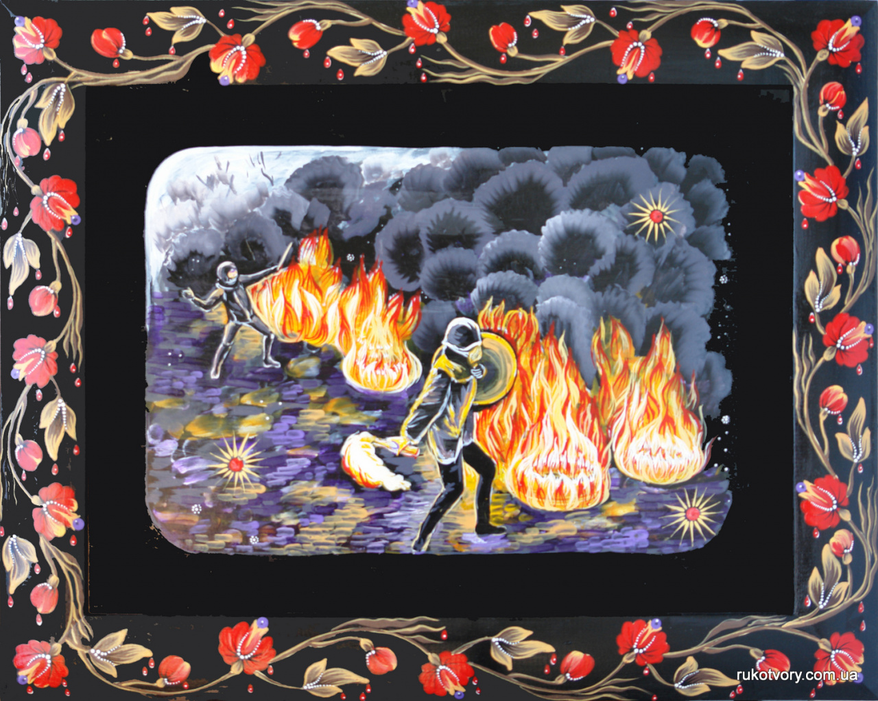 Малює на дереві, двп, папері, склі, шкірі, тканині. Робить настінні розписи.