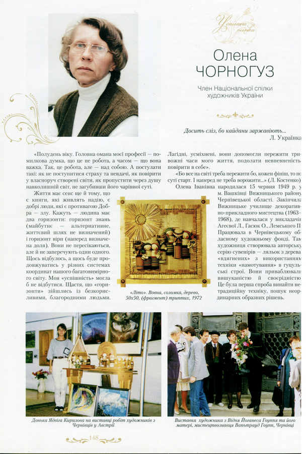 Навчалася спеціальності «Моделювання одягу». Навчання було серйозне — викладали в Вижниці фахівці, яких запрошували з Києва, Москви, Ленінграда. Але, як каже сама, «Кому в 70-ті роки у Чернівцях були потрібні модельєри?» Отож отримала направлення на роботу в Обласний художній фонд на прикладну дільницю. А що таке прикладна дільниця? Місце, де створюють і виготовляють різноманітні сувенірні вироби. Олена, творча натура, в душі — справжній модельєр, вирішила проблему свого фаху так: вона створить ляльку. Яку, природньо, треба одягнути… А виготовить цю ляльку її Роман – з дерева. І все вийшло гарно!
